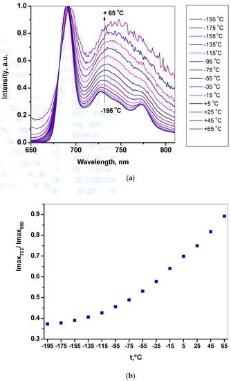 Temperature dependence of photoluminescence spectra for Cu-EtioP in polystyrene film. (a) The spectra measured using a Linkam cryostat with a 20 °C interval from −195 °C to 65 °C; (b) Temperature dependence of the PL intensity ratio (I732nm/I690nm) at band maxima.