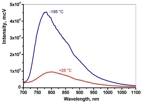 Such transitions, as already noted, occur in porphyrinates of metals with an open electron shell: vanadyl, copper(II), and chromium(III) [,]. However, not all such metal porphyrinates demonstrate such pronounced thermal sensitivity in their luminescence spectra as copper(II) etioporphyrinate. For example, copper(II) tetrafluorenyl-porphyrinate [] and vanadyl tetraphenylporphyrinate [] have weakly structured photoluminescence spectra at 25 °C and even at −196 °C (Figure 3). Luminescence in these complexes is realized only from the 4T1 level [], while in copper(II) etioporphyrinate radiative transitions are realized from both levels 4T1 and 2T1. The emission band at 690 nm appears to correspond to the 2T1–2S0 transition of copper(II) etioporphyrinate, and in the 700–825 nm region, the observed luminescence spectrum is an overlap of the components of the emission band corresponding to the 2T1–2S0 transition and the weakly structured spectrum corresponding to the 4T1–2S0 transition.