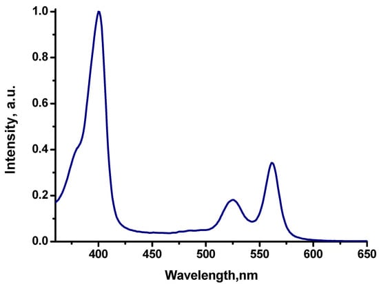 Currently, quite a lot of luminescent temperature sensors based on lanthanides have been created, for which the analysis of temperature changes is based on changes in the lifetime of phosphorescence [,]. However, such sensors require the use of relatively complex devices, such as a phosphorimeter or a photon-counting system, to register the phosphorescence or fluorescence decay curves. In addition, the luminescence intensity of the sensor must be relatively high to register a qualitative decay curve. Luminescent sensors, whose operation is based on measuring the intensity ratio of the emission bands, have clear advantages in terms of using a conventional fluorimeter to register spectra, and modern photomultiplier tubes and semiconductor detectors have very high sensitivity, so even a sensor with high-intensity luminescent glow is not required.