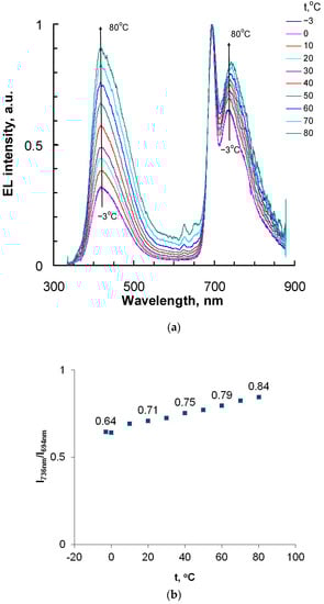 For the OLED, EL spectra were recorded (Figure 5) at various temperatures at an applied voltage of 10 V. To do this, the sample placed on the Peltier elements was first cooled to −3 °C, and then heated to 80 °C. Three bands with maxima at 417, 694 and 736 nm are present in the EL spectra (Figure 6). Bands with maxima at 694 and 736 nm belong to Cu-EtioP, and the band in the blue region of the spectrum (λmax = 417 nm) belongs to the PVK:PBD composite [].