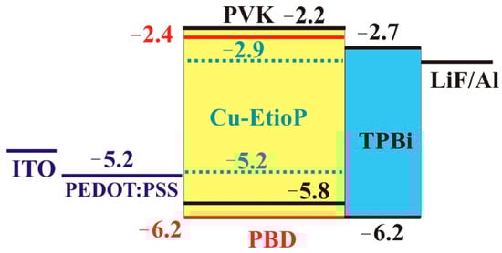 To determine the dependence of the shape of the electroluminescence spectrum on temperature, OLEDs of the following structure were manufactured: ITO/PEDOT:PSS (30 nm)/PVK:PBD:Cu-EtioP (70 nm)/TPBi (20 nm)/LiF(1 nm)/Al (80 nm), where PEDOT:PSS is a hole-injection layer and TPBi [] is an electron-transporting material (blocking holes). The light-emitting layer consisted of a mixture of PVK:PBD and Cu-EtioP with a mass component ratio of 70:30:1. With a higher Cu-EtioP content in the composite, concentration quenching occurs and the intensity of the EL decreases at the same applied voltage. PVK:PBD composite is used to create OLEDs formed by spin-coating from solutions and includes a wide range of phosphors, such as, for example, heavy metal complexes with ligands of different chemical nature [,,] which have phosphorescent properties. PVK serves as a wide-band film-forming matrix with a high position of triplet levels [], and PBD is an electron-conductive dopant which ensures the balance of charge carriers in the light-emitting layer. The energy levels of Cu-EtioP measured using cyclovoltammetry (CVA), according to the method described in [,], are well-suited for the PVK:PBD composite. The OLED energy diagram is shown in Figure 6.