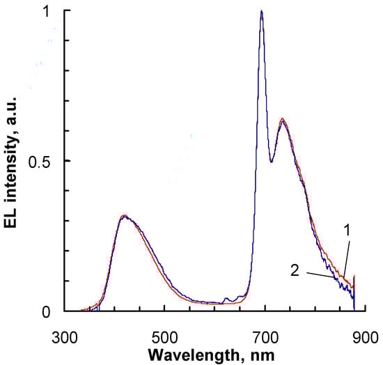 EL spectra at a temperature of 0 °C: (1) before heating; (2) after cooling from 80 °C.