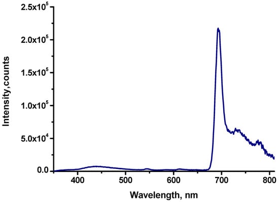 The photoluminescent properties of copper(II) etioporphyrinate were studied in a polystyrene film to protect dye molecules from contact with triplet oxygen molecules in the air. In the photoluminescence spectrum of Cu-EtioP in a polystyrene film at 25 °C, two main maxima of emission bands are observed at 693 nm and 742 nm (Figure 2).