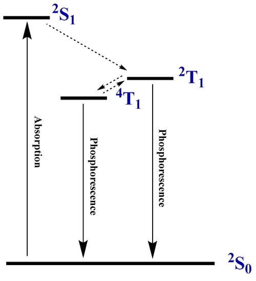 However, when the sample is cooled to −195 °C, the spectrum becomes better resolved and the ratio of the intensities of the main maxima changes significantly. This can be explained by the different temperature dependence of the rate constants of the radiative transitions from the trip-doublet 2T1 and trip-quartet 4T1 electronic levels to the main sing-doublet level 2S0 (Scheme 1).