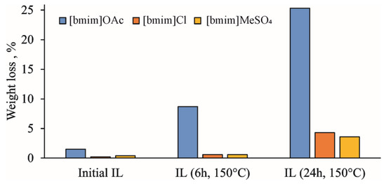 The active accumulation of volatile degradation products during the thermal treatment of IL at 150 °C is clearly illustrated by the weight loss upon holding the samples in a vacuum oven at 60 °C overnight (Figure 1). In the case of [bmim]OAc, it reaches 8 and 25% for treatment duration of 6 and 24 h, respectively. The amounts of volatile products were different for the studied ILs, which can be arranged according to the weight loss in the following sequence: [bmim]OAc >> [bmim]Cl > [bmim]MeSO4. This is in complete agreement with the aforementioned concept of the anion basicity effect on ILs’ thermal degradation due to the formation of the NHC intermediate [17,18,19].