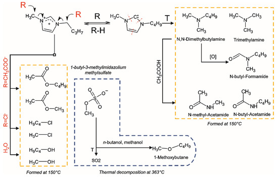 Thermal degradation pathways of the bmim-based ILs with the formation of volatile and semi-volatile compounds.