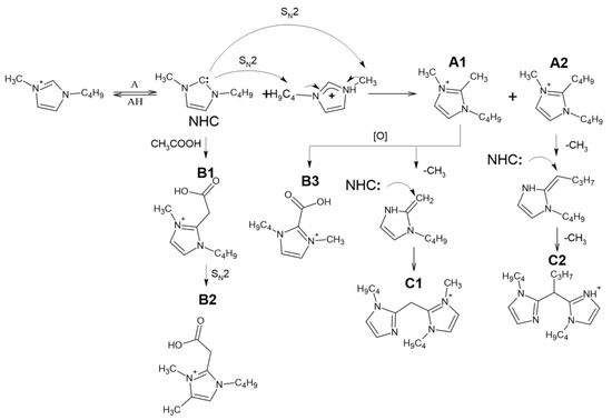 The observed compounds have not been previously described in the literature, and the mechanism of their formation has not yet been fully elucidated. The presence of additional butyl and methyl radicals in A1 and A2 suggested their formation due to dealkylation of the bmim cation. Obviously, the formation of NHC initiates these interactions. The resulting intermediate NHC is quite reactive and has nucleophilic properties. Being a reactive nucleophile, NHC undergoes alkylation by the bmim cation via SN2 nucleophilic substitution to form A1 and A2. Similar reactions occur when the anion interacts with the bmim cation at temperatures above 120 °C [11]. Further oxidation of A1 leads to the formation of B3. Compound B1 is likely to be formed as a result of interaction with acetic acid or acetate anion with bmim carbene by analogy, with the reactions described earlier for pyridinium cycles [26]. However, this interaction resulted in the formation of a transient zwitter ion rather than a stable compound.
