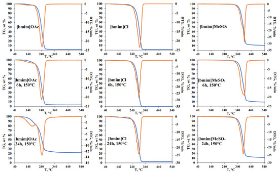The effect of pre-heating on the thermal stability of ILs was studied by STA involving thermal gravimetric (TG), differential scanning calorimetry (DSC), and on-line electron ionization (EI) mass spectrometry of evolved gases. The obtained TG curves for the initial and treated IL samples (Figure 4), as expected, showed the formation of two weight loss ranges. The first one (140–220 °C) is common for all studied ILs, and is related mainly to evaporation of accumulated volatile degradation products. EI-MS measurements within this temperature range (Figure S4) allowed for the detection of ammonia, which can be the product of either deep bmim degradation or EI-induced fragmentation of amines. The observed weight loss at this stage was most pronounced for [bmim]OAc, and reached 5 and 20% for 6 h and 24 h treatments, respectively, which was in a good agreement with the vacuum drying results (Figure 1). Naturally, bmim chloride and, especially, methyl sulfate demonstrated much lower weight loss. However, differential scanning calorimetry (DSC) measurements revealed significant heat flows (endothermic peaks) within this temperature range (Figure S5a).