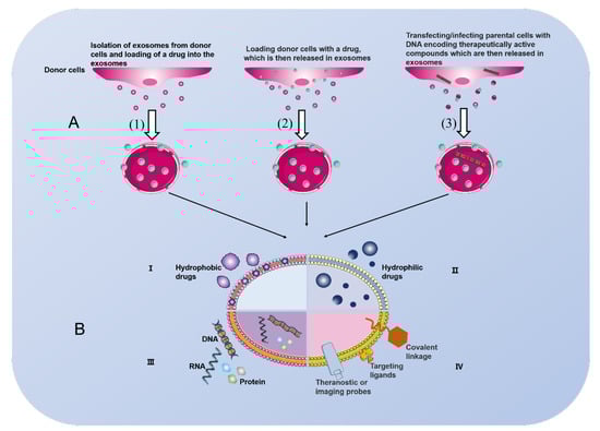 (A): Three different ways to load therapeutic “cargos” into exosomes. (1) Solation of exosomes from donor cells and integration of drugs with them. (2) Integration of drugs into donor cells, where the drugs are contained in their secreted exosomes. (3) Encoded DNA is transfected into donor cells and “cargo” is released in exosomes. (B): Different types of exosome drug delivery systems. Hydrophobic (I) or hydrophilic (II) compounds are bound in the lipid bilayer or in the aqueous phase, respectively. Exosomes can also be used for DNA, RNA, and protein delivery (III). Probes, specific targeting ligands and linker bonds embedded on the surface of exosomes (IV).
