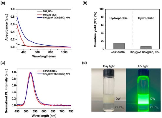 Characterization of SiO2@InP QDs@SiO2 NPs. (a) UV/Vis/NIR absorbance spectra of SiO2 NPs, InP/ZnS QDs, and SiO2@InP QDs@SiO2 NPs. (b) Comparison of quantum yield (QY) between InP/ZnS QDs and SiO2@InP QDs@SiO2 NPs. (c) Comparison of photoluminescence (PL) spectra between InP/ZnS QDs and SiO2@InP QDs@SiO2 NPs. (d) Digital images of SiO2@InP QDs@SiO2 NPs distributed in distilled water (DW).