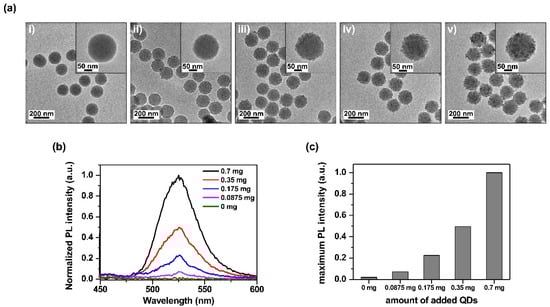 Brightness control of SiO2@InP QDs@SiO2 NPs. (a) TEM image of SiO2@InP QDs@SiO2 NPs via the amount of added QDs. The amount of added QDs were (i) 0 mg, (ii) 0.0875 mg, (iii) 0.175 mg, (iv) 0.35 mg, and (v) 0.7mg per 1 mg of SiO2 NPs. (b) Normalized PL intensity spectra of SiO2@InP QDs@SiO2 NPs via amount of added QDs. (c) Maximum PL intensity of SiO2@InP QDs@SiO2 NPs via amount of added QDs at 527 nm emission wavelength.