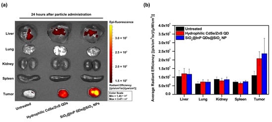 To assess the applicability of SiO2@InP QDs@SiO2 NPs in bioimaging tumors in vivo, tumor syngeneic mice were intravenously administered SiO2@InP QDs@SiO2 NPs and hydrophilic CdSe/ZnS QDs (2.22 × 1011 particles/mL each) via the tail vein. At 24 h after intravenous administration, the biodistributions of the SiO2@InP QDs@SiO2 NPs and hydrophilic CdSe/ZnS QDs in major organs (liver, lung, kidney, and spleen) and in tumors of tumor syngeneic mice were monitored by measuring the fluorescence signal of the QDs using an IVIS imaging system (Figure 4a). Owing to the enhanced permeability and retention (EPR) effect, both SiO2@InP QDs@SiO2 NPs and hydrophilic CdSe/ZnS QDs prominently accumulated at the tumor site compared to those in other major organs [,,]. To investigate the residual fluorescence signal of particles accumulated in the tumor, the average radiant efficacy in major organs and tumors was measured (Figure 4b). The SiO2@InP QDs@SiO2 NPs showed significantly higher fluorescence in the tumor tissue compared to those in other organs and in the untreated control. More importantly, the retention of the SiO2@InP QDs@SiO2 NPs at the tumor site was clearly observed, with a similar or comparable efficiency to that of the hydrophilic CdSe/ZnS QDs. Hence, we suggest that SiO2@InP QDs@SiO2 NPs can be utilized as an alternative to CdSe-based QDs for bioimaging, owing to their outstanding fluorescence signal and excellent biocompatibility.