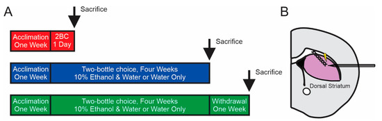 - Rhodes, J.S.; Best, K.; Belknap, J.K.; Finn, D.A.; Crabbe, J.C. Evaluation of a simple model of ethanol drinking to intoxication in C57BL/6J mice. Physiol. Behav. 2005, 84, 53–63. [Google Scholar] [CrossRef]