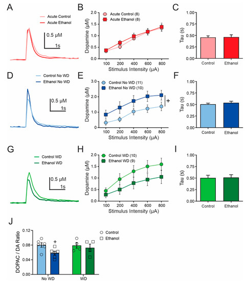 2.2. Dopamine Release and Tissue Content Were Not Significantly Altered by Acute or Chronic Ethanol Consumption