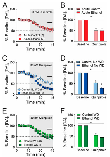 We next examined presynaptic mechanisms regulating dopamine release. The D2 dopamine autoreceptor is a Gi/o-coupled GPCR that will inhibit dopamine release upon activation. Exploiting this property, we applied the D2-like dopamine receptor agonist, quinpirole, at 30 nM (IC50 for inhibition of dopamine release in dorsal striatum) [24]. In all of the groups we found a significant main effect of quinpirole to inhibit dopamine release (Figure 4; Acute: (F(1,6) = 68.47, p < 0.001); Chronic No WD (F(1,15) = 140.6, p < 0.001); Chronic WD, (F(1,13) = 120.9, p < 0.001)). In the acute drinking group, we found no significant effects of treatment (F(1,6) < 0.001, p = 0.976) or a quinpirole X treatment interaction (F(1,6) < 0.001, p = 0.976) (Figure 4A,B). In contrast, in the chronic ethanol drinking no WD group, we found a treatment (F(1,15) = 6.193, p = 0.025) and quinpirole X treatment interaction (F(1,15) = 6.193, p = 0.025) such that quinpirole induced inhibition of dopamine release was sensitized relative to the control group (Figure 4C,D). These effects were reversed following one week of withdrawal as we found no significant effects of treatment (F(1,13) = 1.223, p = 0.289) or quinpirole X treatment interaction (F(1,13) = 1.223, p = 0.289) in the chronic ethanol drinking WD and control group (Figure 4E,F). In a separate mixed-effects model analysis, we compared the quinpirole effect between No WD and WD groups and found significant effects of quinpirole (F(1,15) = 249.4, p < 0.001), withdrawal status (F(1,15) = 6.741, p = 0.02), and a quinpirole X withdrawal status interaction (F(1,11) = 6.741, p = 0.025)