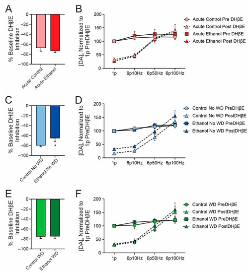 Activation of striatal cholinergic interneurons has been shown to facilitate dopamine release via activation of nAChRs located on dopamine axons [25,26,27,28]. Thus, pharmacological blockade of nAChRs will decrease electrically stimulated dopamine release. This blockade of nAChRs inhibited dopamine release equally between control and acute ethanol drinking mice (t(10) = 0.76, p = 0.465; Figure 5A). To examine potential differences in tonic and phasic release in this group, we applied electrical stimuli at different frequencies (10, 50, and 100 Hz) to emulate phasic dopamine release. We found significant effects of stimulation frequency (F(3,30) = 50.94, p < 0.001), DHβE application (F(1,10) = 15.88, p = 0.002), and a stimulation frequency X DHβE application interaction (F(3,30) = 58.20, p < 0.001) such that phasic stimulation in the presence of DHβE facilitated dopamine release (Figure 5B). In the chronic ethanol drinking no WD group, the nAChR inhibition was reduced relative to the control group with one pulse stimulations (t(13) = 2.248, p = 0.043) suggesting a decreased contribution of cholinergic signaling to dopamine release (Figure 5C). Following phasic stimulation, we found significant effects of stimulation frequency (F(3,45) = 69.87, p < 0.001), DHβE application (F(1,15) = 74.37, p < 0.001), a stimulation frequency X DHβE application (F(3,33) = 45.65, p < 0.001) and a treatment x DHβE application (F(1,33) = 4.2, p < 0.05) (Figure 5D). In the chronic ethanol drinking WD group, nAChR inhibition did not differ between ethanol drinking and control mice (t(20) = 0.058, p = 0.954) demonstrating that even one week of withdrawal can reverse some of the neurobiological adaptations to chronic ethanol drinking (Figure 5E). Similar to previous groups, following phasic stimulation, we found significant effects of stimulation frequency (F(3,39) = 51.21, p < 0.001), DHβE application (F(1,13) = 36.33, p = 0.002), and a stimulation frequency X DHβE application (F(3,39) = 52.76, p < 0.001) (Figure 5F). In a separate analysis, we examined the effect of withdrawal status on DHβE inhibition with a 3-way ANOVA (DHβE, withdrawal status, and ethanol treatment) and found significant effects of DHβE (F(1,27) = 916, p < 0.001), ethanol treatment (F(1,27) = 4.55, p = 0.042), and a DHβE X ethanol treatment interaction (F(1,27) = 4.55, p = 0.042).