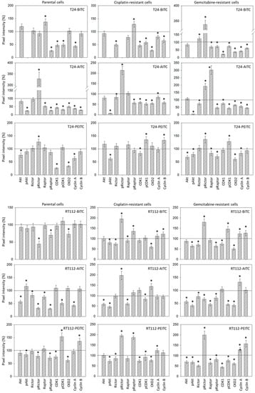 - Jung, J.H.; You, S.; Oh, J.W.; Yoon, J.; Yeon, A.; Shahid, M.; Cho, E.; Sairam, V.; Park, T.D.; Kim, K.P.; et al. Integrated proteomic and phosphoproteomic analyses of cisplatin-sensitive and resistant bladder cancer cells reveal CDK2 network as a key therapeutic target. Cancer Lett. 2018, 437, 1–12. [Google Scholar] [CrossRef] [PubMed]