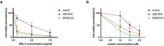 Since the first comprehensive description of ferroptosis occurred for HT-1080 cells [4], and this cell line is the object of the majority of the studies on ferroptosis, this cell line was chosen as the object of the investigation for the potential connection between ferroptosis and the JNK pathway. In the first set of experiments, ferroptosis was induced by the two typical ferroptosis inducers: erastin and RSL-3. As expected, both erastin and RSL-3 treatments resulted in a significant decrease in cell viability (Figure 1). Interestingly, the co-treatment of HT-1080 cells with JNK inhibitors, such as JNK-IN-8 or SP600125, could decrease cell viability even more when compared to the cells treated solely with RSL-3 or erastin (Figure 1).