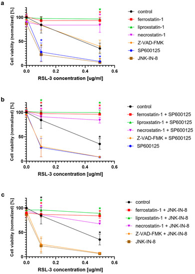 The potential effect of the inhibitors in alleviating cell death induced by RSL-3 in the presence or absence of the JNK inhibitors. HT-1080 cells were treated on a 96-well plate for 24 h with the ferroptosis-inducing compound RSL-3 (0.1 µg/mL and 0.5 µg/mL) in the presence or absence of inhibitors of interest and combinations of them: ferrostatin-1 (5 µM), liproxstatin-1 (500 nM), necrostatin-1 (50 µg), Z-VAD-FMK (50 µg), JNK-IN-8 (10 µg) and SP600125 (5 µg). Ferroptosis inhibitors, ferrostatin-1, liproxstatin-1, and necroptosis inhibitor necrostatin-1, inhibit RSL-3 induced ferroptosis both in the presence or absence of the JNK inhibitors, while the apoptosis inhibitor, Z-VAD-FMK, has no effect in either case. Cell viability was measured by MTT assay. Data are normalized to the untreated control, and each data point represents the average ± SD from at least three independent experiments. (a) * Significantly different (p < 0.05) from group control (RSL-3 treated without co-treatment). (b) * Significantly different (p < 0.05) from RSL-3 and JNK-IN-8 co-treated. (c) * significantly different (p < 0.05) from RSL-3 and SP600125 co-treated.
