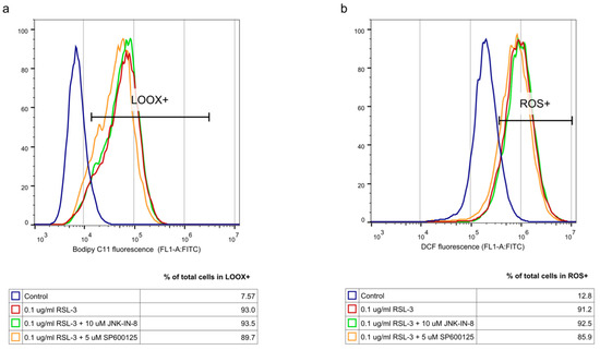 Pharmacological inhibition of JNK activity does not affect the oxidative aspects of RSL-3-induced ferroptosis. HT-1080 cells were treated on a 24-well plate for 2 h with the ferroptosis-inducing compound, RSL-3 (0.1 µg/mL), in the presence or absence of the JNK inhibitors, JNK-IN-8 (10 µM) or SP600125 (5 µM). RSL-3 treatment causes oxidative stress through (a) lipid peroxidation (LOOX) and (b) ROS formation, but JNK inhibition does not affect either lipid peroxidation or ROS formation. Cells were prepared, stained, and measured with a flow cytometer, as described above, using a Bodipy C11 fluorescent probe for lipid peroxidation and a DCF fluorescent probe for ROS measurement. Control samples were fluorescent-labelled but untreated. One representative experiment is shown. Cell population was gated using FSC-W for singlets and propidium iodide negative staining (living cells).