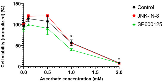 Pharmacological inhibition of JNK activity does not affect ascorbate-induced cell death in HT-1080 cells. HT-1080 cells were treated on a 96-well plate for 24 h with ascorbate (0.1–2 mM). Co-treatment with JNK inhibitors, JNK-IN-8 (10 µM) or SP600125 (5 µM), does not significantly affect the ascorbate-induced cell death. Cell viability was measured by MTT assay. Data are normalized to the untreated control and each data point represents the average ± SD from at least three independent experiments. * Significantly different (p < 0.05) from untreated.