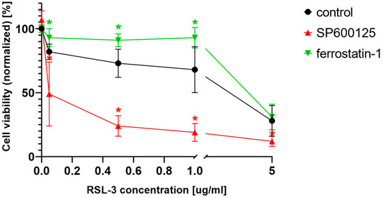 Pharmacological inhibition of JNK activity enhances the effect of ferroptosis inductor, RSL-3, in MIA PaCa-2 cells. MIA PaCa-2 cells were treated on a 96-well plate for 24 h with the ferroptosis-inducing compound, RSL-3 (0.05–5 µg/mL). RSL-3 treatment, within all applied concentrations, significantly decreased cell viability. Co-treatment with JNK inhibitor, SP600125 (5 µM), significantly decreased cell viability compared to only RSL-3 treatment. Ferroptosis inhibitor, ferrostatin-1 (10 µM), inhibits ferroptosis inducement at lower RSL-3 concentrations. Cell viability was measured by MTT assay. Data are normalized to untreated control and each data point represents the average ± SD from at least three independent experiments. * Significantly different (p < 0.05) from group control (RSL-3 treated without co-treatment).