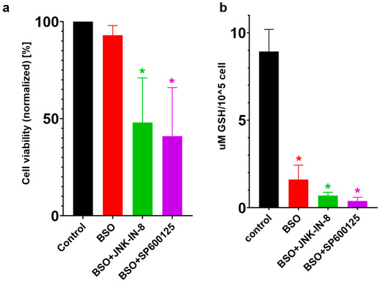 From the beginning of ferroptosis research, it has been well known that GSH depletion plays a central role in the induction of ferroptosis since RSL-3 behaves as a specific inhibitor for the lipid ROS scavenger, GPX4 [24], and erastin causes a marked depletion in GSH, the substrate of GPX4 [4,24,26]. Later, it was observed that the HNE-induced phosphorylation of JNK/c-Jun could be completely blocked by GSH supplementation [32], demonstrating that JNK/c-Jun overactivation resulted from GSH depletion. GSH supplementation blocked JNK/c-Jun activation and cell death, demonstrating that JNK/c-Jun overactivation is the downstream effect of GSH depletion. Further results also reinforced this assumption since the inhibition of GSH depletion resulted in decreased HNE-induced JNK activation [32]. Therefore, the effect of JNK inhibitor co-treatment was also investigated in BSO-treated (GSH depleted) HT-1080 cells. It was found that, similar to erastin treatment (Figure 1b), cell viability could be further decreased by JNK inhibitor co-treatment in BSO-treated HT-1080 cells (Figure 7). Based on these observations, GSH may play a central role in the cell death amplifying effect of JNK inhibitors. Thus, GSH content/depletion could be another candidate for switching the anti-cancer effect in JNK inhibitors.
