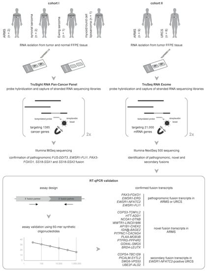 mRNA capture sequencing and RT-qPCR for the detection of pathognomonic, novel, and secondary fusion transcripts in FFPE sarcoma tissue. Cohort I, comprising six patients with a known pathognomonic fusion, is profiled using the TruSight RNA Pan-Cancer Panel. These data validated the mRNA capture sequencing analysis workflow for the identification of fusion transcripts. Subsequently, a second cohort of sarcomas that were designated fusion gene-negative by FISH analysis was analyzed using TruSeq RNA Exome sequencing. Multiple pathognomonic, novel, and secondary fusion transcripts were picked up and confirmed by RT-qPCR.