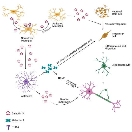 - Rahimian, R.; Béland, L.C.; Kriz, J. Galectin-3: Mediator of microglia responses in injured brain. Drug Discov. Today 2018, 23, 375–381. [Google Scholar] [CrossRef]