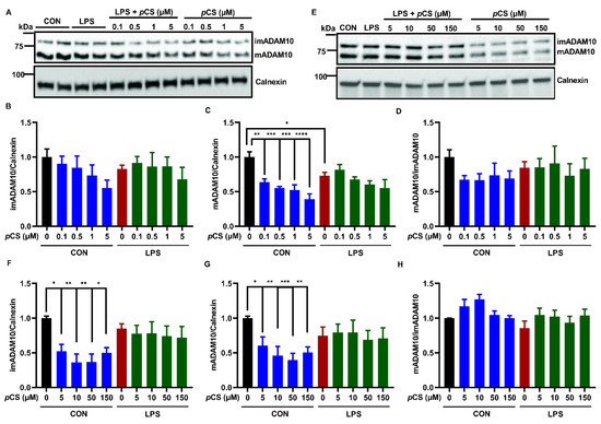 Exposure of BV2 cells to LPS showed a decrease in mADAM10, but showed no significant effect on imADAM10 and ADAM10 maturation efficiency (mADAM10/imADAM10) when compared to vehicle control (Figure 1A–H). The expression of imADAM10 and mADAM10 was barely affected by exposure to LPS-stimulated BV2, with pCS low (0.1, 0.5, 1 and 5 μM, Figure 1A–C) and high (5, 10, 50 and 150 μM, Figure 1E–G) concentrations compared to LPS control; this was also reflected by no significant change in ADAM10 maturation efficiency (Figure 1D,H). In contrast, pCS alone at the low concentrations reduced mADAM10 without affecting imADAM10 expression and ADAM10 maturation efficiency (Figure 1A–D). Furthermore, pCS alone at the high concentrations reduced the expression of imADAM10 and mADAM10 without affecting ADAM10 maturation efficiency (Figure 1E–H).