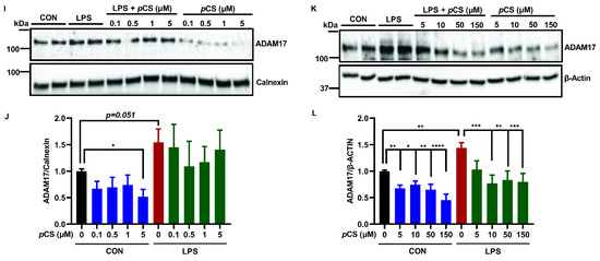The 24 h incubation with LPS induced upregulation of ADAM17 expression in BV2 cells (Figure 1J,L). Co-incubation of LPS-stimulated BV2 cells with pCS at high concentrations (5, 10, 50 and 150 μM) demonstrated a reduced expression of ADAM17 (Figure 1L). Moreover, these concentrations of pCS reduced the constitutive ADAM17 expression in BV2 cells (Figure 1J,L).