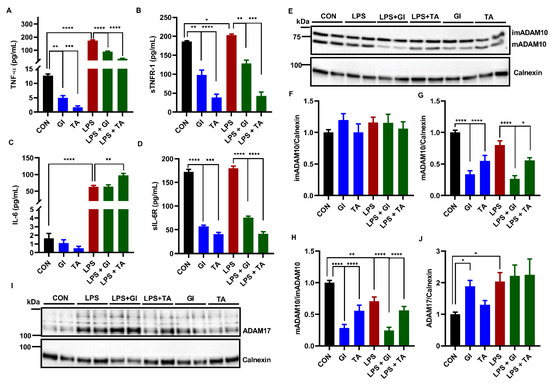 The effect of ADAM10 inhibitor (GI254023X) or ADAM17 inhibitor (TAPI-1) on the release of TNF-α, TNFR-1 and IL-6R by constitutively and under inflammation BV2 microglia. BV2 microglia were incubated with GI254023X (5 μM) or TAPI-1 (25 μM) for 24 h in the absence or presence of 1000 ng/mL LPS. The medium was collected for ELISA measurements and cell lysates were lysed for WB analysis. The concentration of TNF-α (A), sTNFR-1 (B), IL-6 (C) and sIL-6R (D) released in medium (n = 6 from 6 independent experiments). (E) The representative immunoblots of ADAM10 protein expression in BV2 cell lysate. (F–H) The quantification of ADAM10 expression in BV2 cell lysate (n = 10 from 5 independent experiments). (I) The representative immunoblots of ADAM17 expression in BV2 cell lysate. (J) The quantification results of ADAM17 in BV2 cell lysate (n = 8 from 4 independent experiments). Calnexin was used as a loading control. Black: constitutive cytokine release or protein expression set at 1; red: LPS-induced cytokine release or protein expression; blue: effect of ADAMs inhibitor on constitutive cytokine release or protein expression; green: effect of ADAMs inhibitor on LPS-induced cytokine release or protein expression. Results were expressed as mean ± SEM. * p < 0.05, ** p < 0.01 *** p < 0.001, **** p < 0.0001.