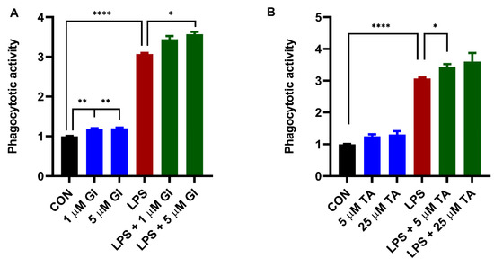 The effect of ADAM10 inhibitor (GI254023X) or ADAM17 inhibitor (TAPI-1) on constitutively and LPS-induced BV2 microglial phagocytosis activity. BV2 microglial cells were incubated with GI254023X (1 and 5 μM) or TAPI-1 (5 and 25 μM) for 24 h in the absence or presence of 1000 ng/mL LPS. (A) The effect of GI254023X treatment on BV2 microglial phagocytosis activity. (B) The effect of TAPI-1 treatment on BV2 microglial phagocytosis activity. Black: constitutive phagocytes set on 1; red: LPS-induced phagocytosis; blue: effect of ADAMs inhibitor on constitutive phagocytosis; green: effect of ADAMs inhibitor on LPS-induced phagocytosis. Results were expressed as mean ± SEM. n = 4 from 4 independent experiments. * p < 0.05, ** p < 0.01, **** p < 0.0001.