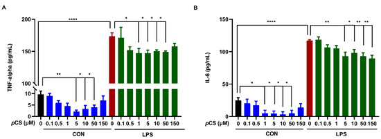 The effect of pCS on TNF-α and IL-6 releases by BV2 microglia. The BV2 microglial cells (5.000 per well) were incubated with pCS for 24 h with or without LPS (1000 ng/mL). (A) The concentration of TNF-α in culture medium: n = 3 from 3 independent experiments. (B) The concentration of IL-6 in culture medium: n = 4 from 4 independent experiments. Black: constitutive cytokine release; red: LPS-induced cytokine release; blue: effect of pCS on constitutive cytokine release; green: effect of pCS on LPS-induced cytokine release. Results are expressed as mean ± SEM. * p < 0.05, ** p < 0.01, **** p < 0.0001.