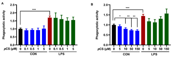 24 h LPS stimulation of BV2 cells significantly increased phagocytosis by BV2 cells (Figure 5). Co-incubation of BV-2 cells with pCS and LPS did not result in a significantly different phagocytotic response compared to LPS control, demonstrating that pCS cannot affect the LPS-induced phagocytotic response (Figure 5). In contrast, Figure 5B shows that pCS (10, 50 and 150 μM) significantly decreased constitutive phagocytotic activity of BV2 cells compared to vehicle control.