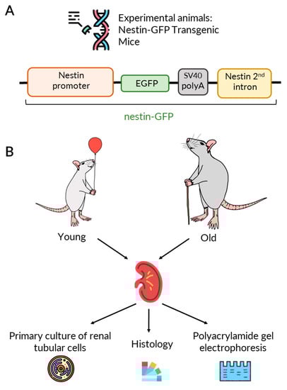 Aging affects most of the organism’s functions, with a well-documented deteriorating impact on health. Kidneys, like other organs, undergo physiological changes with age, impairing many essential renal functions []. Kidney aging is associated with the loss of both glomeruli and tubules. In addition to nephron loss, glomerulosclerosis and tubulointerstitial fibrosis are observed in the old kidneys, which were proposed to serve as compensatory mechanisms for replacing lost structures []. Decrease in kidney function as a result of acute kidney injury (AKI) occurs mainly in elderly people []. Moreover, the kidneys of old people are more susceptible to damage [], and AKI in such patients is more likely to transform into chronic kidney disease (CKD) [].