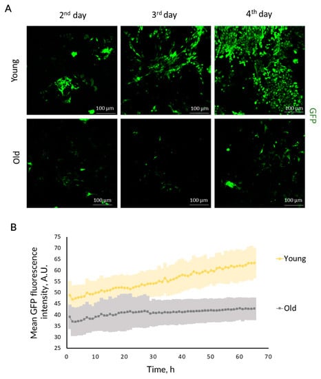 Furthermore, we analyzed the accumulation of GFP-positive cells in the RTC cultures from nestin-GFP mice, collecting the entire GFP fluorescence intensity in the well. Fluorescence was measured for three consecutive days starting from the 2nd day of cultivation. We observed that GFP fluorescence intensity increased faster in the RTC cultures obtained from young nestin-GFP mice (Figure 3A,B), indicating higher proliferation of nestin+ cells than in RTC cultures from old mice.