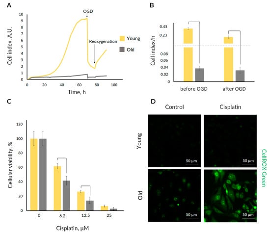 We compared the effect of damaging factors, namely OGD and cisplatin cytotoxicity, on the RTCs from young and old nestin-GFP mice (Figure 4). We performed OGD with real-time monitoring of cell proliferation to assess the change of regenerative response to an injury during aging. Under normal conditions, RTCs from young mice showed a much faster growth rate than RTCs from old mice (Figure 4A,B; see the growth rate before OGD).