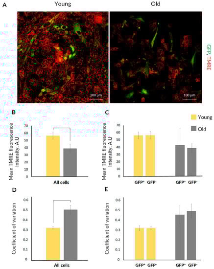 Mitochondrial membrane potential in RTC cultures from young and old nestin-GFP mice. (A) Representative confocal images of RTC cultures loaded with TMRE (n = 3). (B) Comparison of mitochondrial membrane potential measured by TMRE fluorescence in total RTCs population from young and old kidneys (mean ± SD; p-value < 0.05 (U-test)). (C) Mitochondrial membrane potential in the GFP-positive and GFP-negative cells in RTC cultures (mean ± SD; p-value < 0.05 (U-test)). (D) Coefficient of variation of mean TMRE fluorescence intensity in total RTCs population from young and old kidneys (mean ± SD; p-value < 0.05 (U-test)). (E) Coefficient of variation of mean TMRE fluorescence intensity in the GFP-positive and GFP-negative cells in RTC cultures (mean ± SD; p-value < 0.05 (U-test)).