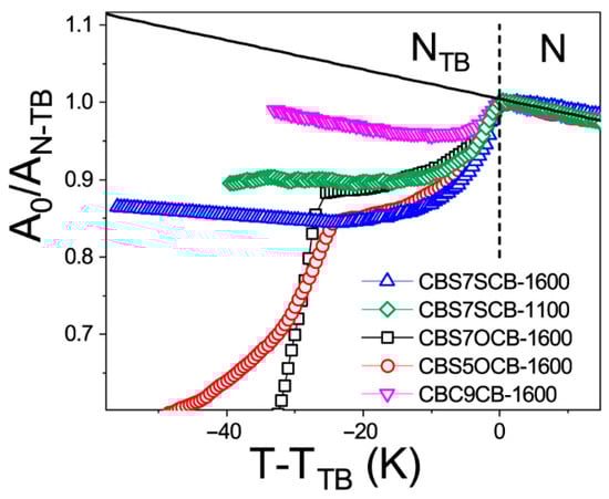 A detailed analysis of the infrared spectra compared to those simulated for different conformers, along with the exact assignments of vibrations, is presented in a separate paper []. Several vibrational bands that belonged to the longitudinal and transverse transition dipole that showed significant dichroism of the band were selected to be analyzed. For the longitudinal transition dipole moment, the phenyl stretching band (νCC) at 1600 cm−1 and the C-H deformation vibration in the benzene plane at 1100 cm−1 (βCH) were selected. The band at 1100 cm−1 was a vibration that involved a sulfide group, so it may be a good indicator of the dimer’s conformational change []. Figure 1 shows the temperature dependencies of the average absorbances, A0, for the bands corresponding to the longitudinal transition dipole. We introduced the nematic phase trend line as a reference: the solid black line in Figure 1. There was a clear transition from the conventional N phase to the NTB for all of the molecules, except for CBOC7OCB, which behaves like a classical calamitic molecule. This is attributed to its large opening angle and which is responsible for not forming the NTB phase. The absorbances involving the biphenyl group (1600 cm−1 and 1100 cm−1 in Figure 1), and also the band at 2220 cm−1 (that involved a cyan group), show a significant decrease just after entering the NTB phase (see Table 1). This indicates the structure rearrangement in the NTB phase, resulting in the antiparallel orientation of the neighboring cyanobiphenyl groups. Both dipole–dipole interaction and London dispersion forces are likely involved in this process that stabilizes the NTB phase. It seems the nanosegregation process proceeds along the Z-axis of the system. A similar conclusion has already been presented for cyanobiphenyl-based LCs, showing an overlap of the termini of the molecules [,,,]. Following the transition to the NTB, a significant decrease in the average absorbance was measured, suggesting the presence of dipole correlations in this phase and the presence of other molecular interactions related to the change in the system’s geometry.