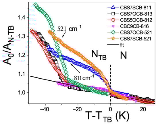 For a symmetric dimer (CBSC7SCB), the average absorbance of the transversal dipole is affected by the transition to the NTB phase. However, in contrast to the longitudinal ones, they show a significant increase in their trend for all transversal dipoles. For the asymmetric dimers (CBSC7OCB), however, two steps of the temperature changes in the NTB phase could clearly be distinguished (for transversal dipoles of sulfur linkages 811 and 521 cm−1): the first extending almost 30 K below the N–NTB transition temperature and the second below this range. In the first region, the absorbance continued to increase as the molecular density increased to nearly 30 K below the N–NTB transition temperature. Then, the absorbances of the sulfur linkages (811 and 521 cm−1) started to grow significantly. This was conveyed by the further absorbance decrease of the longitudinal dipole (Figure 1). Such behavior indicates the emergence of another interaction which causes so-called bond orientation and an escape from the uniaxial arrangement []. Please note the absorbance for CBC9CB is not affected by the N–NTB transition. All the above can prove the leading role of the sulfur group in the emergence of bond orientations. They are involved in the π–π stacking interactions and in hydrogen bonds between neighbors. It should be pointed out that the vibration that involved the sulfur group (~811 cm−1) showed an absorbance increase, while the other with the oxygen group (~820 cm−1) did not.