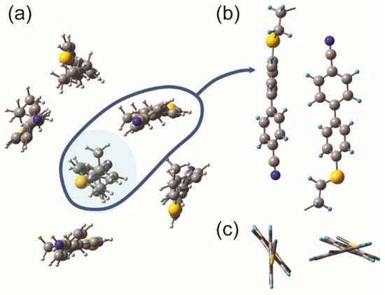 In order to determine the molecular arrangement in the NTB phase for the system, including the nearest lateral neighborhood, the geometry of the system was optimized based on the arrangement of the six interacting molecules. These are the monomers with a sulfur atom CBSC7, Figure 3a, and the hybrid system containing the CBSC7 and the CBOC7 molecules. After optimization, it was observed that the distance between the rigid mesogens decreased (ranging from 4.1 Å to 4.7 Å), which corresponds very well with the average lateral intermolecular distance determined from X-ray scattering measurements (~4.5 Å) for such molecules []. The differences are mainly due to ignoring/neglecting the thermal aspect in this DFT simulation. A group of the molecules were arranged into pairs and a shift of the molecular axes relative to each other was detected (see Figure 3b). As observed in numerous physical experiments, a nanosegregation into pseudolayers–biphenyls “stacking” next to each other, creating an aromatic pseudolayer, and the spacer tending to be parallel to form an aliphatic layer was observed as well. The molecules with a sulfide bridge are coaligned so that the phenyl planes of cyanobiphenyl remain in the so-called “T-shape” conformation (Figure 3c) relative to their neighbors. In the case of oxygen bridged molecules, a flatter “parallel-displaced” arrangement was observed. The segregation of the aromatic parts (partial overlapping) and an attraction of the CN group to the alkyl chains were observed. Molecular interdigitating also occurred [,].