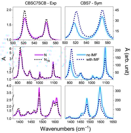 Comparison of the theoretical and experimental spectra for the symmetric dimer. Left Panel: Experimental spectra of the CBS7SCB dimer, solid magenta line—the nematic phase, short black dotted line—the twist–bend nematic phase (spectrum is represented for 5 μm cell). Right Panel: Simulations for the CBS7 monomer: solid blue line—spectra for an isolated molecule (no IMF), short navy dotted line—a system of six interacting molecules (with IMF).