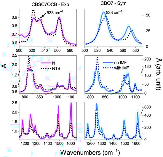Comparison of the theoretical and experimental spectra for the asymmetric dimer. Left Panel: Experimental spectra of the CBS7OCB dimer, solid magenta line—the nematic phase, short black dotted line—the twist–bend nematic phase (spectrum is represented for 5 μm cell). Right Panel: Simulations for the CBO7 monomer: solid blue line—spectra for an isolated molecule (no IMF), short navy dotted line—a system of six interacting molecules (with IMF).