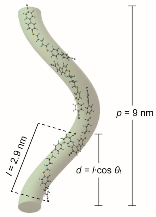 Proposed hypothetical arrangement of the thioether dimers in the twist–bend nematic phase. The helix pitch was computed as p = 2π/q, where q is the wave vector.