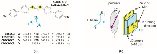 (a) Transition temperature and molecular structure of the cyanobiphenyl dimers with a molecular frame of reference: z—long axis (bowstring), x—axis normal to the bent plane, y—bow arrow axis. (b) Schematic of the polarized infrared transmission technique at a normal incidence of light. The planar cell’s laboratory frame (X, Y, Z). In the nematic phase, Z was the axis along and X was perpendicular to the optical axis (the optical axis coincided with the rubbing direction). In the NTB phase, Z coincided with the helix axis.