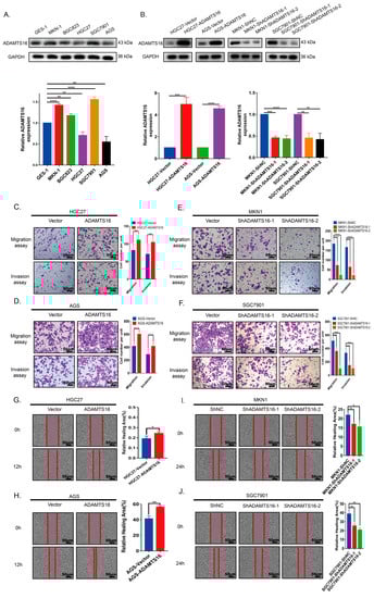 We used western blotting to detect the endogenous expression of ADAMTS16 in GC cell lines (Figure 1A). HGC27 and AGS cell lines with low endogenous ADAMTS16 expression were selected to construct lentiviral vector-transfected cells stably overexpressing ADAMTS16 (Figure 1A), while MKN1 and SGC7901 cell lines with high endogenous ADAMTS16 expression were selected to construct lentiviral vector-transfected cells with stable knockdown of ADAMTS16 (Figure 1A). Stable cell construction is shown in Figure 1B. Transwell assays indicated that ADAMTS16 overexpression promoted HGC27 (p < 0.001, Figure 1C) and AGS (p < 0.0001, Figure 1D) cells migration more than the control group. Similarly, invasion assays showed that ectopic expression of ADAMTS16 markedly enhanced cell invasive ability in both HGC27 (p < 0.001, Figure 1C) and AGS cells (p < 0.0001, Figure 1D). Conversely, as predicted, the inhibition of ADAMTS16 expression decreased MKN1 and SGC7901 cells migration and invasion (both p < 0.0001, Figure 1E,F). Moreover, wound healing assays demonstrated that ADAMTS16 overexpression promoted cell horizontal migration in GC cells HGC27 (p < 0.05, Figure 1G) and AGS (p < 0.01, Figure 1H), whereas ADAMTS16 downregulation inhibited it in MKN1 (ShNC vs. ShADAMTS16-1, p < 0.01; ShNC vs. ShADAMTS16-2, p < 0.05; Figure 1I) and SGC7901 (both p < 0.01, Figure 1J).