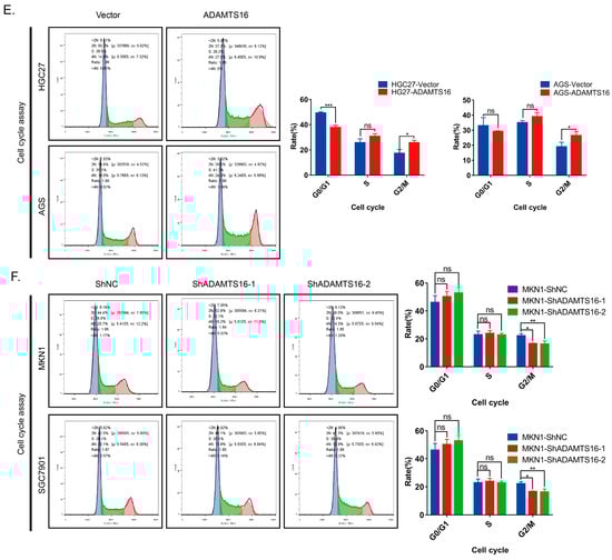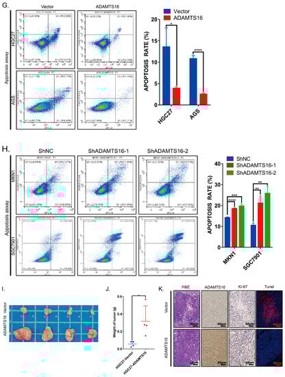 ADAMTS16 overexpression significantly enhanced HGC27 and AGS clonogenicity compared to the controls by clone formation assays (both p < 0.0001, Figure 2A). As expected, the cell proliferation significantly increased for HGC27 at 12 h (HGC27-Vector vs. HGC27-ADAMTS16, p < 0.01; Figure 2B) and AGS at 36 h (AGS-Vector vs. AGS-ADAMTS16, p < 0.01; Figure 2B). Conversely, ADAMTS16 knockdown reduced the clonogenic ability of MKN1 (ShNC vs. ShADAMTS16-1, p < 0.01; ShNC vs. ShADAMTS16-2, p < 0.0001; Figure 2C) and SGC7901 (ShNC vs. ShADAMTS16-1, p < 0.0001; ShNC vs. ShADAMTS16-2, p < 0.0001; Figure 2C). Meanwhile, MKN1 (ShNC vs. ShADAMTS16-1, p < 0.05; ShNC vs. ShADAMTS16-2, p < 0.0001; Figure 2D) and SGC7901 (ShNC vs. ShADAMTS16-1, p < 0.05; ShNC vs. ShADAMTS16-2, p < 0.01; Figure 2D) cell proliferation were restrained at 24 h, respectively. To further explore the mechanism by which ADAMTS16 promotes cell growth, we analyzed cell cycle and apoptosis by flow cytometry. HGC27 and AGS overexpressing ADAMTS16 had more cells distributed in the G2/M phase than the control group (HGC27-Vector vs. HGC27-ADAMTS16, p < 0.05; AGS-Vector vs. AGS-ADAMTS16, p < 0.05; Figure 2E). In contrast, in ADAMTS16 knockdown MKN1 (ShNC vs. ShADAMTS16-1, p < 0.05; ShNC vs. ShADAMTS16-2, p < 0.01; Figure 2F) and SGC7901 (ShNC vs. ShADAMTS16-1, p < 0.01; ShNC vs. ShADAMTS16-2, p < 0.01; Figure 2F) cell lines, the proportion of cells in the G2/M phase decreased compared with the control group. As expected, in apoptosis assays, ectopic expression of ADAMTS16 significantly decreased the proportion of apoptosis in HGC27 and AGS cells (HGC27-Vector vs. HGC27-ADAMTS16, p < 0.05; AGS-Vector vs. AGS-ADAMTS16, p < 0.0001; Figure 2G), while silencing expression of ADAMTS16 dramatically increased the proportion of apoptosis in MKN1 (ShNC vs. ShADAMTS16-1, p < 0.0001; ShNC vs. ShADAMTS16-2, p < 0.001; Figure 2H) and SGC7901 (ShNC vs. ShADAMTS16-1, p < 0.01; ShNC vs. ShADAMTS16-2, p < 0.01; Figure 2H) cells. These results revealed that ADAMTS16 upregulation stimulates cell growth by promoting cell proliferation and inhibiting cell apoptosis.