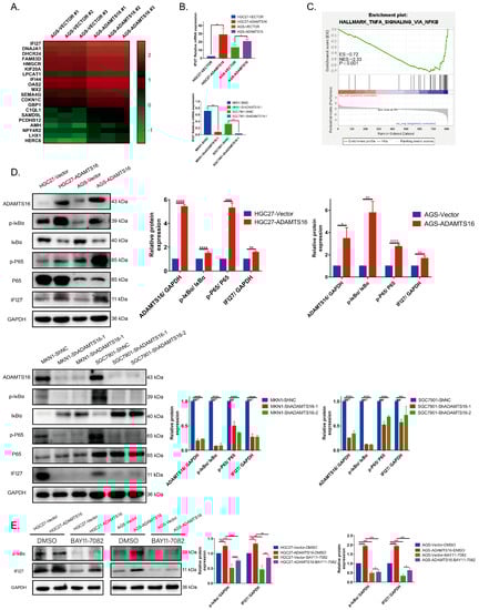 To identify the ADAMTS16-mediated signal transduction pathways that promote GC cell growth and invasion, we performed RNA-Seq and bioinformatics analyses of AGS-vector/ADAMTS16 cells. A total of 806 genes altered their mRNA expression, of which 363 were upregulated (ADAMTS16/vector) and 443 were downregulated (Figure S1). The top 20 most differently expressed genes are listed in Figure 3A. Among them, we focused on IFI27. Moreover, we also found a significant positive correlation between the mRNA expression of IFI27 and ADAMTS16 (Figure 3B). These findings suggest that IFI27 may play an important role in ADAMTS16-induced promotion of GC cell growth, migration, and invasion. Furthermore, GSEA analysis indicated that the HALLMARK_TNFA_SIGNALING_VIA_NFKB (Figure 3C) pathway was enriched, suggesting that ADAMTS16 promotes cell migration, invasion, and proliferation through the NF-κB/IFI27 axis.