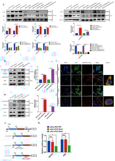 In this study, ADAMTS16 overexpression upregulated nuclear phosphorylated P65, while ADAMTS16 knockdown significantly downregulated it (Figure 3F). Co-immunoprecipitation revealed that ADAMTS16 can bind to IκBα (Figure 3G,H). Immunofluorescence showed that ADMTS16 was co-localized with IκBα in HGC27 and AGS cytoplasm (Figure 3I). We also explored the possibility that P65 directly affects IFI27 gene transcription. We analyzed the transcription start site of IFI27 using the JASPAR database. The analysis identified two binding sites that P65 may occupy (Table S1). P65 binding appears to activate the expression of IFI27. To investigate this possibility using dual-luciferase reporter assays, we produced the luciferase reporter constructs (pGL3-IFI27-WT, Mut1, and Mut2; Figure 3J). The transcription levels of Mut1 and Mut2 were decreased in HGC27 and AGS cells compared with WT when co-transfected with pCDNA3.1-P65-3xFlag (HGC27: pGL3-IFI27-WT vs. pGL3-IFI27-Mut2, p < 0.05; AGS: pGL3-IFI27-WT vs. pGL3-IFI27-Mut2, p < 0.01; Figure 3K). This indicates that P65 could bind to the promoter region of IFI27 from −1618 to −1609 bp. These results suggest that ADAMTS16 induces the expression of IFI27 through the NF-κB pathway and possibly through direct transcriptional activation.